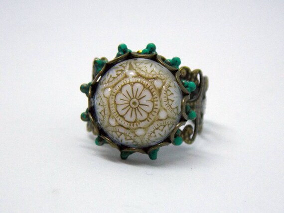 FREE SHIPPING coupon on Ornate Etched Ring Vintage Ivory Cream Gold Lucite Cabochon Patina Brass Adjustable Ring Gift Jewelry by NickiLynnJewelry