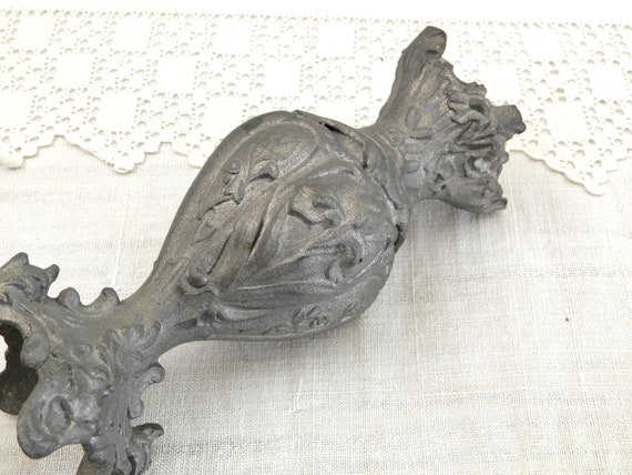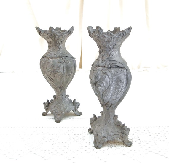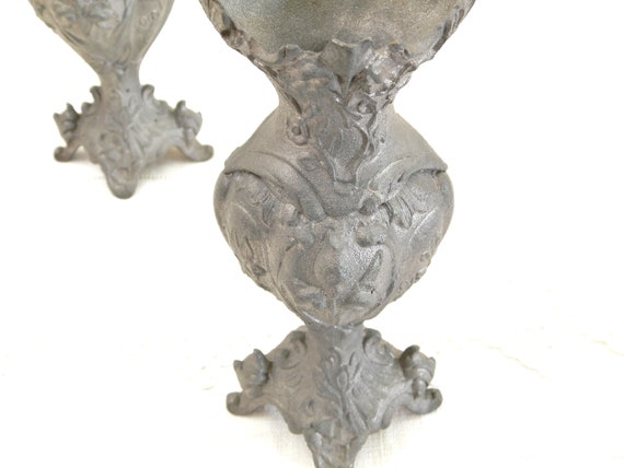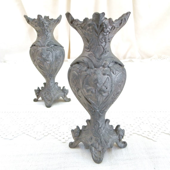 20% OFF coupon on Pair Antique French Cast Metal Grey Ornate Vase, 2 Matching Decorated with Floral Pattern Vases from France, Boudoir Brocante Decor by VintageDecorFrancais