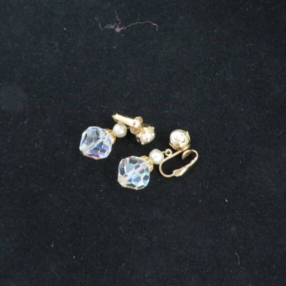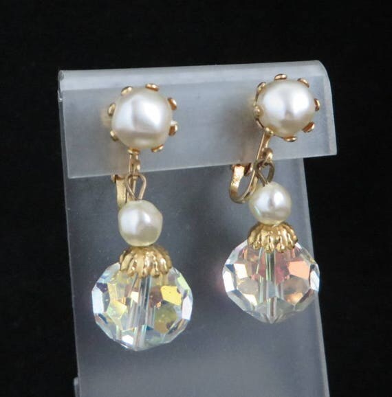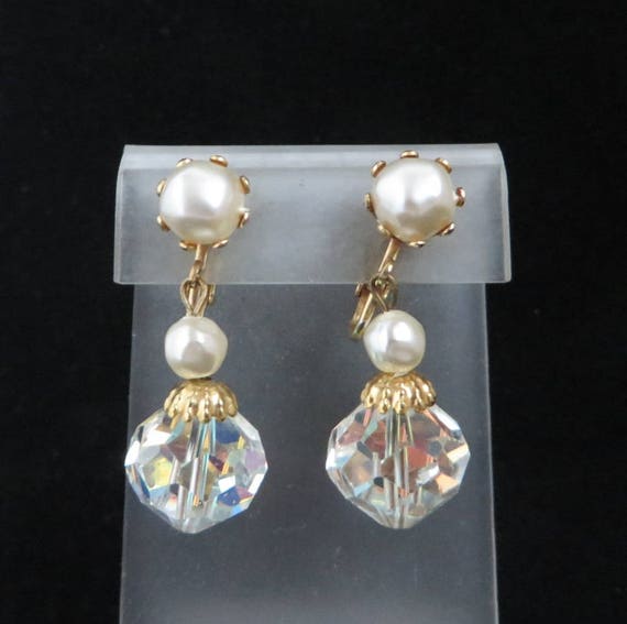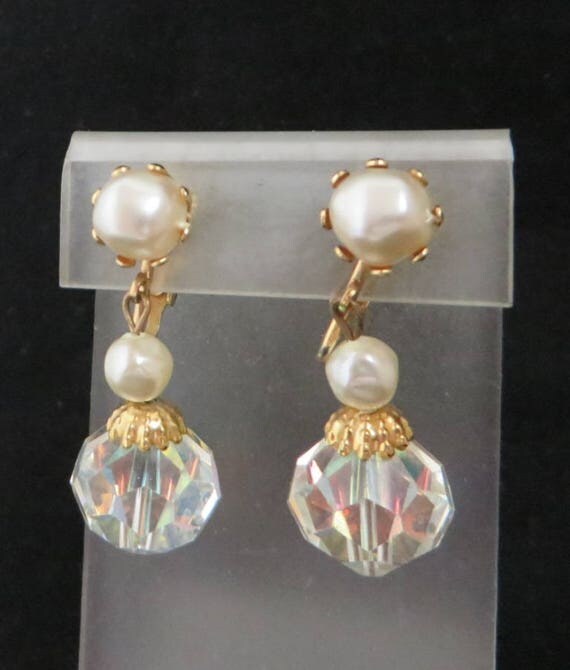 15% OFF coupon on Pearl & Crystal Earrings - Vintage Gold Tone Dangling Crystal Clip-on Earrings, Bridal Jewelry, Gift for Her by LeesVintageJewels