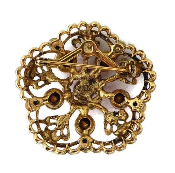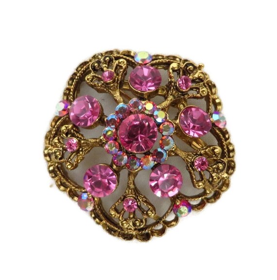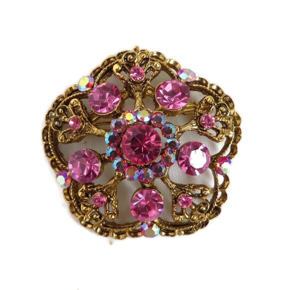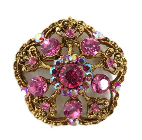 15% OFF coupon on Pink Rhinestone Brooch, Mid Century Pin, Vintage Weiss Pink Rhinestone Brooch, AB Rhinestone Gold Tone Signed Designer Pin by LeesVintageJewels