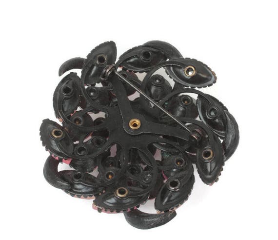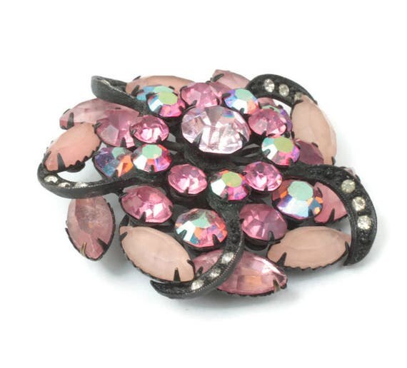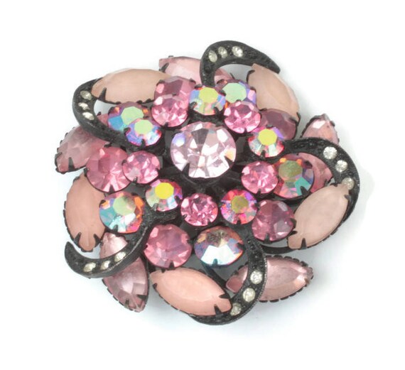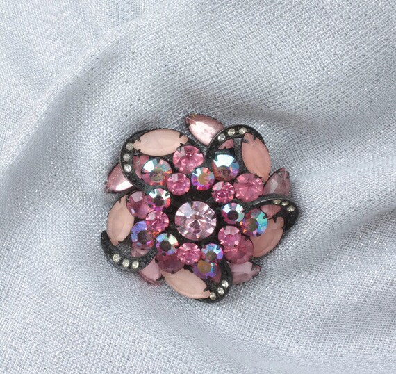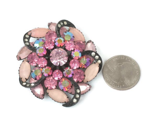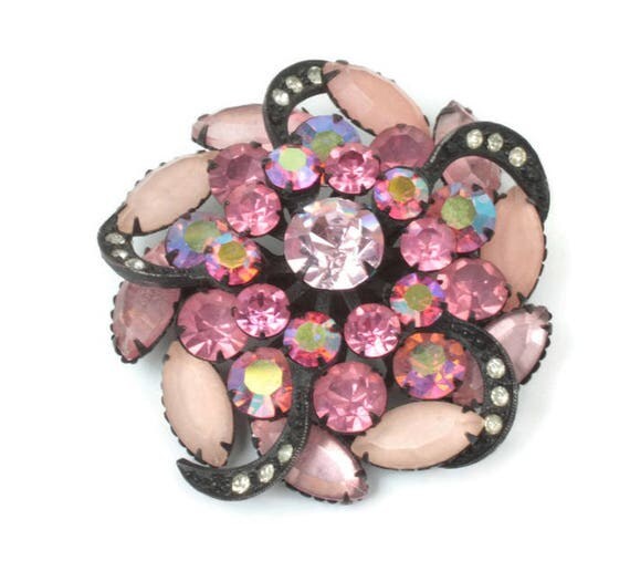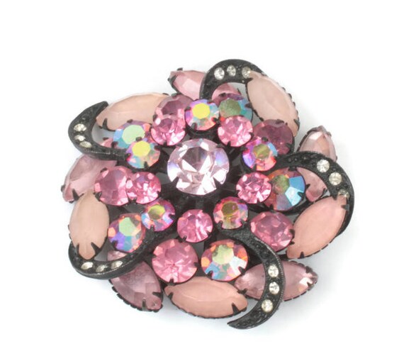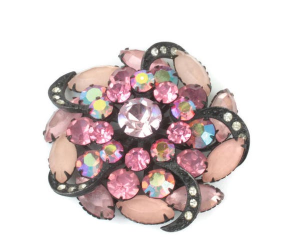 15% OFF coupon on Pink Rhinestone Pinwheel Brooch AB Frosted Stones Japanned Finish Dimensional Vintage by PastSplendors