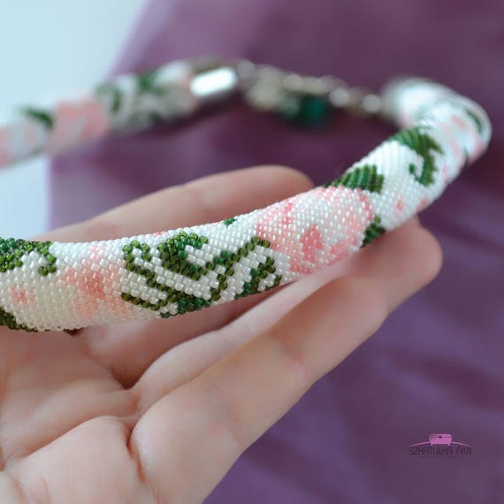 10% OFF coupon on Pink rose Flower necklace Beaded crochet rope Seed beads necklace Gift for her Beading necklace Handmade Tube knitting Flower white womens by SzkatulkaAmiJewelry