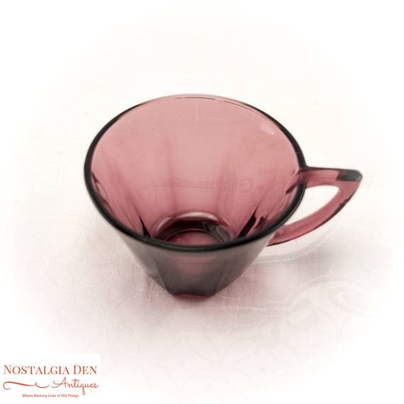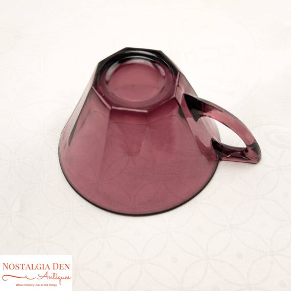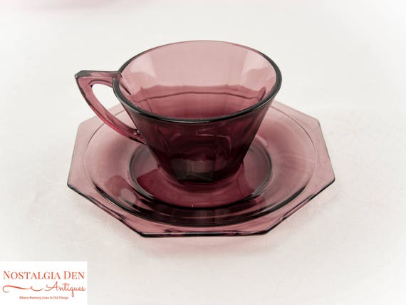 15% OFF coupon on Purple Depression Glass Cup and Saucer Set | Moroccan Amethyst | Vintage Hazel Ware | Glass Cups and Saucers | MCM Kitchen Decor by NostalgiaDenClassics