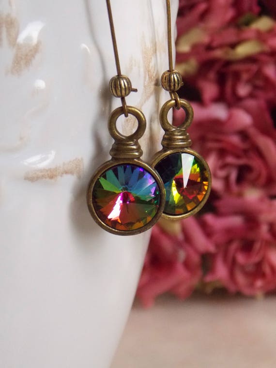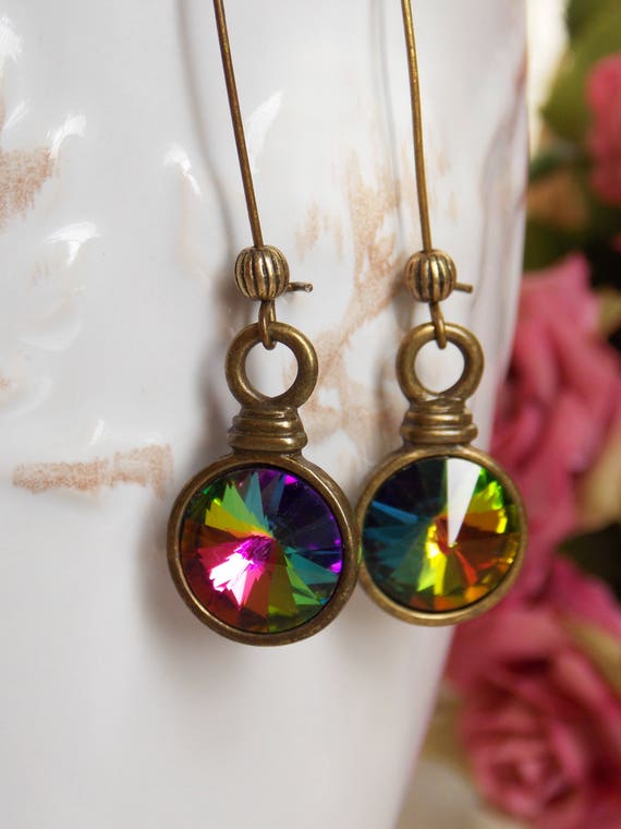 FREE SHIPPING coupon on Rainbow Swarovski Crystal Rivoli Long Earrings Vintage Style Green Blue Yellow Crystal Brass Dangle Gift by NickiLynnJewelry