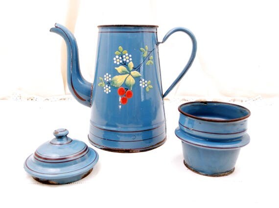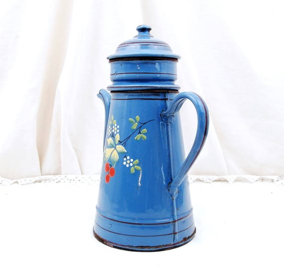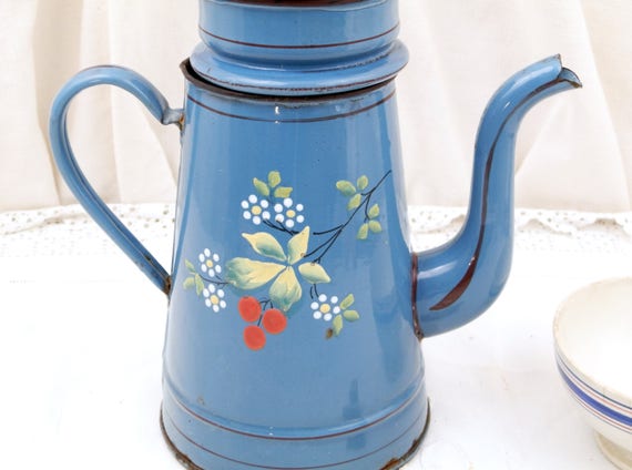 20% OFF coupon on Rare Antique Hand Painted Blue Gooseneck Kettle Flower Pattern Chippy Enamelware Coffee Pot, Cafetière, French Country Decor, Cottage France by VintageDecorFrancais