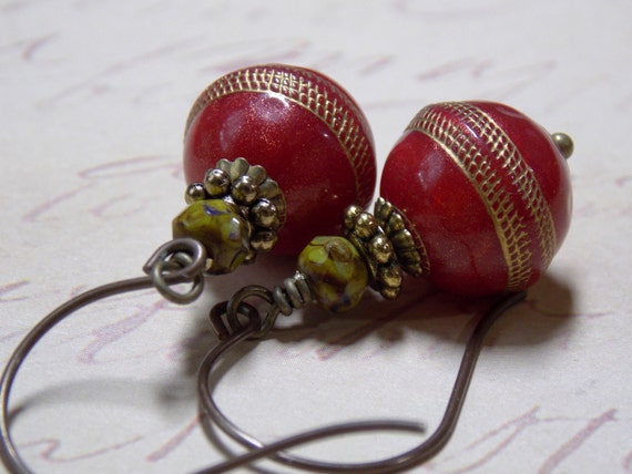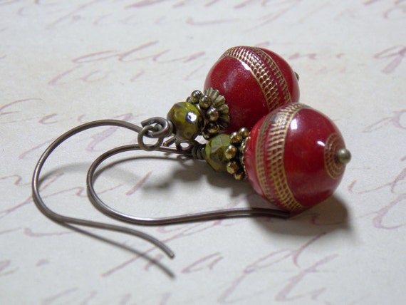FREE SHIPPING coupon on Red Earrings Vintage Red Gold Round Beads Sparkle Gold Shimmer Holiday Earrings Mossy Green Rustic Stones Woodland Bohemian Earrings by NickiLynnJewelry