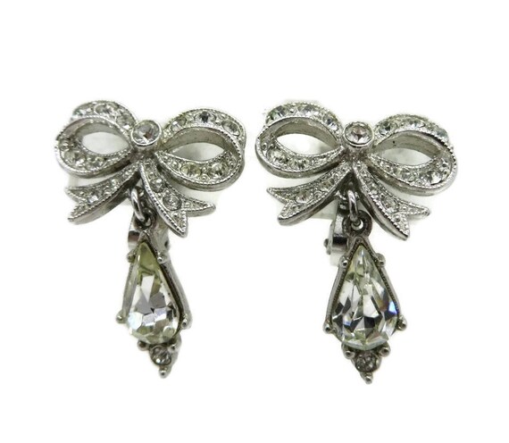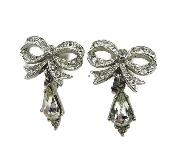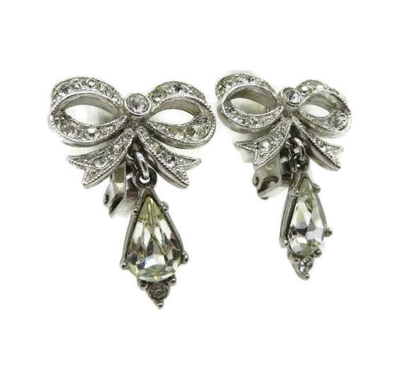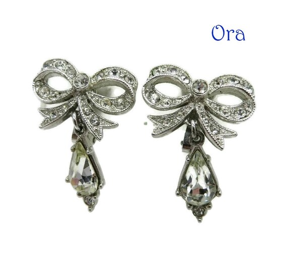 15% OFF coupon on Rhinestone Bow Earrings - Vintage Signed ORA Crystal Dangle Clip-on Earrings, Bridal Jewelry, Valentine's Day Gift by LeesVintageJewels