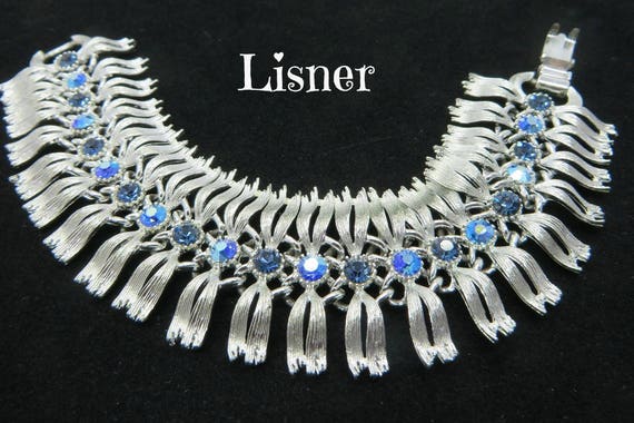 15% OFF coupon on Rhinestone Bracelet, Blue AB Rhinestone Bracelet, Vintage Lisner Egyptian Revival Silver Tone Wide Wavy Link Bracelet by LeesVintageJewels