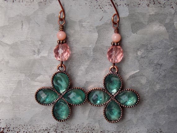 FREE SHIPPING coupon on Rose Gold Earrings Pale Pink & Teal Cross Earrings Rose Gold Copper Aqua Blue Spiritual Pastel Long Boho Earrings by NickiLynnJewelry