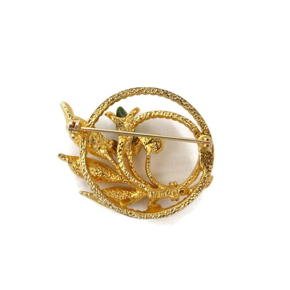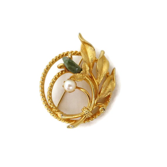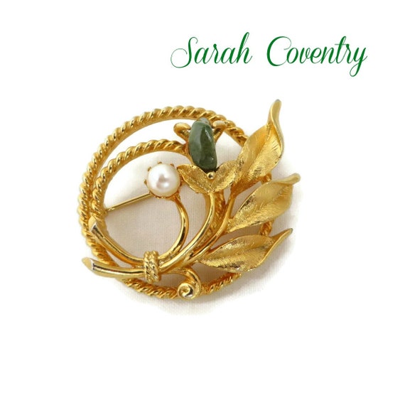 15% OFF coupon on Sarah Coventry Circle Brooch, Twisted Gold Tone Flower Pin with Faux Pearl and Jade Greet Nugget by LeesVintageJewels