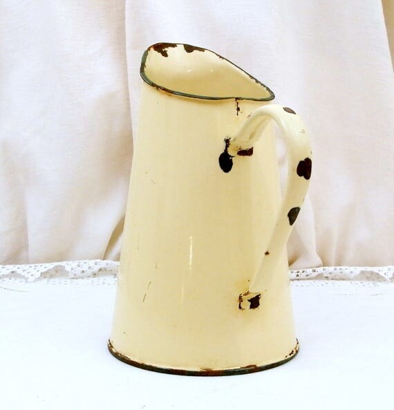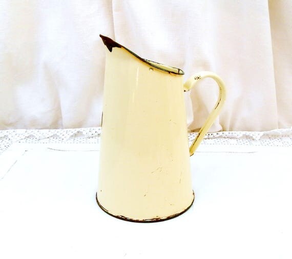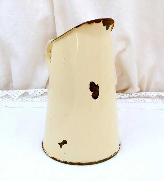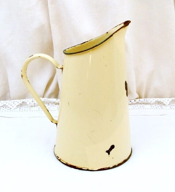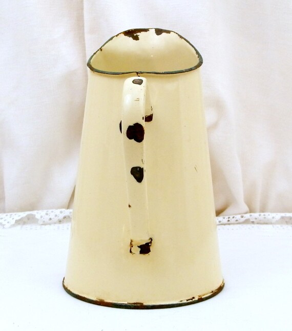 20% OFF coupon on Small Antique French Pale Yellow / Beige French Enamelware Pitcher, Chippy Enamel Jug / Vase by VintageDecorFrancais