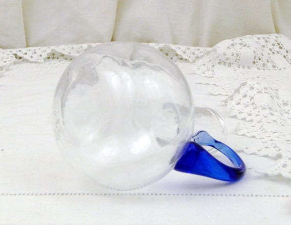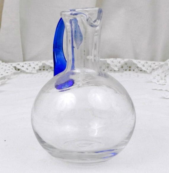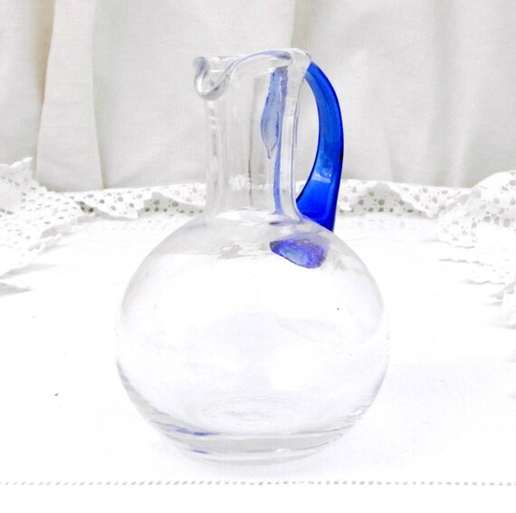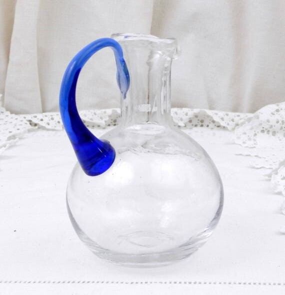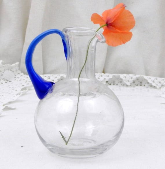 20% OFF coupon on Small Vintage Blown Glass Handmade Vase / Jug with Blue Handle, Glass Oil Bottle, French Vintage Table Decor, Retro Home Interior by VintageDecorFrancais