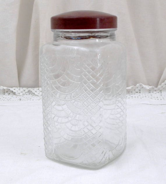20% OFF coupon on Square Vintage Art Deco Design Pattern Glass Jar with Bakelite Lid from France, French, Retro, Kitchen, 1930, Transparent, Glassware, Home by VintageDecorFrancais