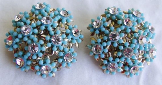 10% OFF coupon on Storewide 25% Off SALE Vintage Baby Blue Beaded Cluster Style Designer Clip Earrings Featuring Subtle Rhinestone Accented Embellishments by ClevelandFinds