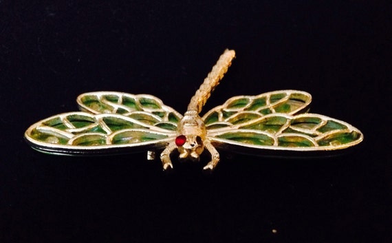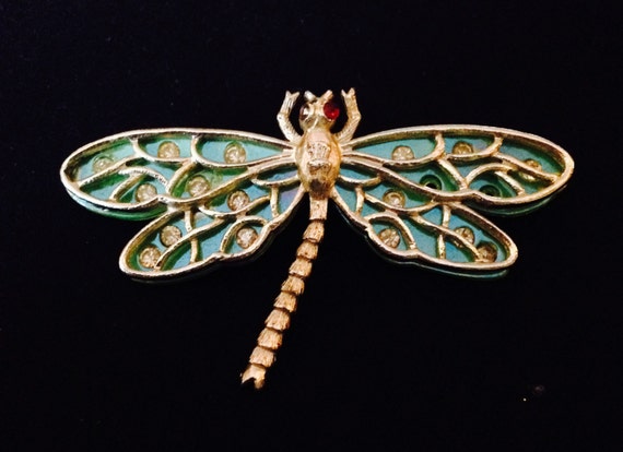 10% OFF coupon on Storewide 25% Off SALE Vintage Silver Tone Emerald Green Stained Glass Style Dragonfly Brooch Featuring Clear Rhinestone Embellishments Desi by ClevelandFinds