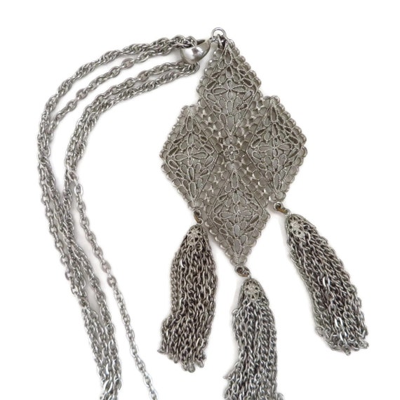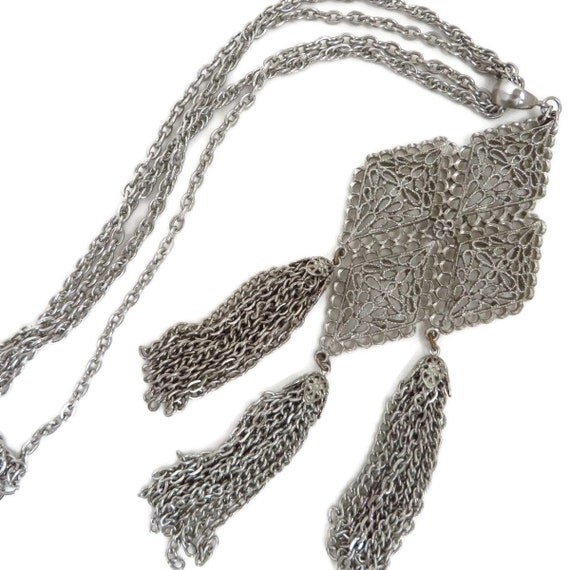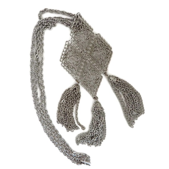 15% OFF coupon on Tassel Necklace, Vintage Pendant Necklace, Silver Tone Double Chain Link Necklace, Large Filigree Pendant, Boho Statement Jewelry by LeesVintageJewels