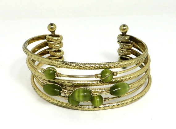 30% OFF coupon on Tiger Eye Bracelet, Vintage Multistrand Bracelet, Green Tiger Eye Cuff, Gold Tone Cuff Bracelet by LeesVintageJewels