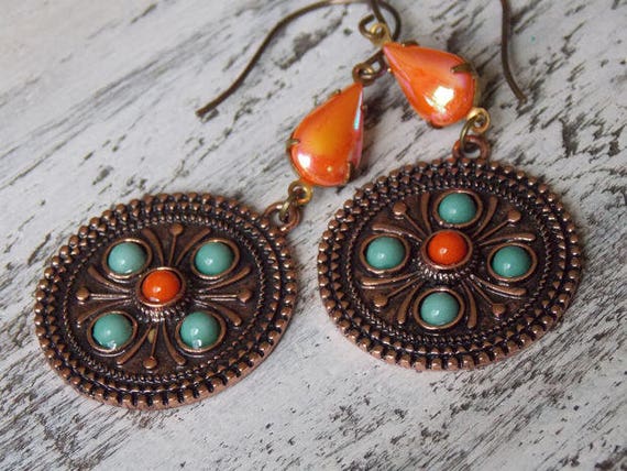 FREE SHIPPING coupon on Turquoise and Orange Western Drop Earrings Southwestern Dangle Long Vintage Teardrop Earrings by NickiLynnJewelry