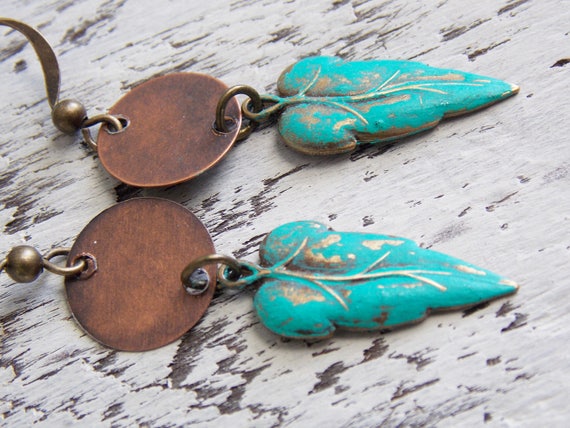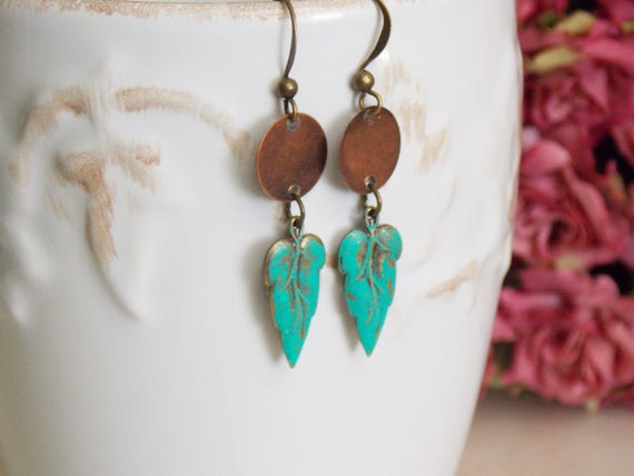FREE SHIPPING coupon on Verdigris Leaf Earrings Brass Patina Earrings Green Blue Drop Rustic Copper Metal Disk Dangle Bohemian Boho Woodland Jewelry Gift Earrings by NickiLynnJewelry
