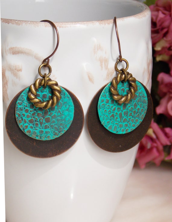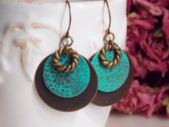 FREE SHIPPING coupon on Verdigris Patina Brass Earrings- Green Blue Dangle Drop Bohemian Earrings -Metal Earrings-Boho Earrings-Rustic Woodland Earrings by NickiLynnJewelry