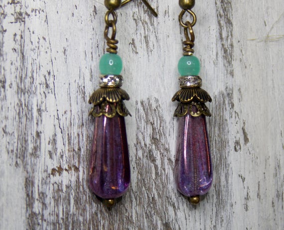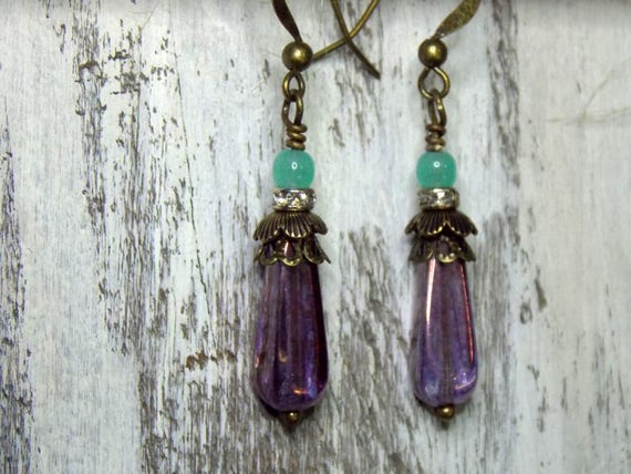 FREE SHIPPING coupon on Victorian Czech Glass Dangle Earrings Vintage Style Downton Abbey Jane Austen Jewelry Purple Green Opal Teal Gemstone Spindle Earrings by NickiLynnJewelry