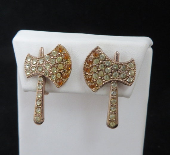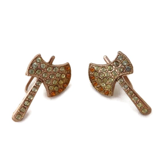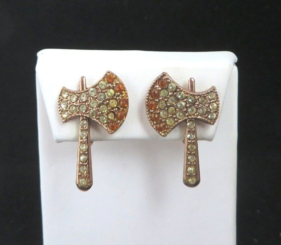 15% OFF coupon on Vintage '50s Novelty Earrings, Copper Toned Rhinestone Tomahawk Screwback Earrings by LeesVintageJewels