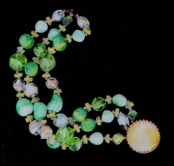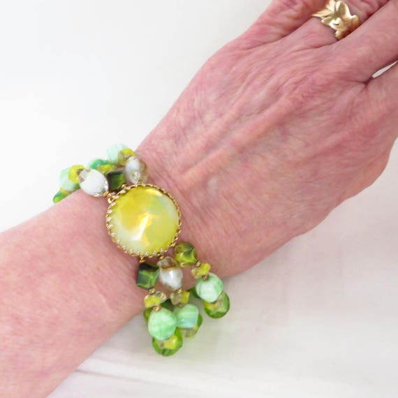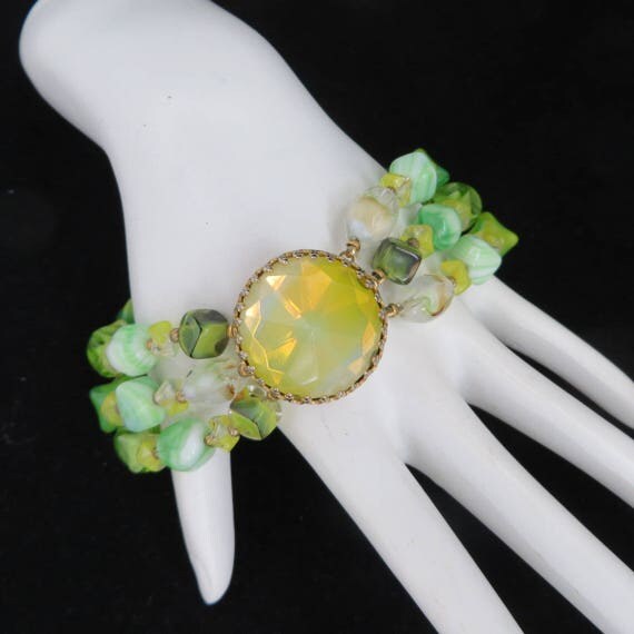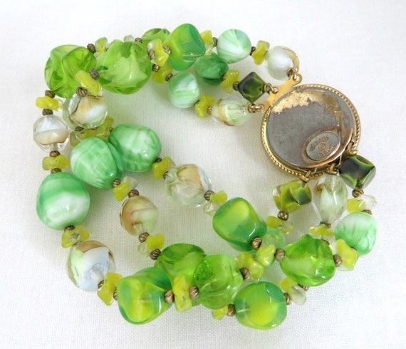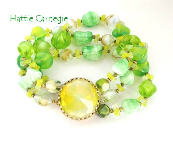 15% OFF coupon on Vintage Bracelet - Hattie Carnegie Crystal Bracelet, Three Strand Green Glass Bracelet, Designer Signed Bracelet by LeesVintageJewels