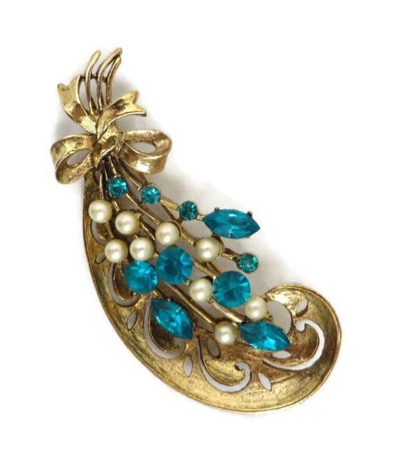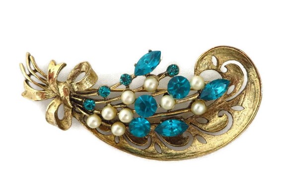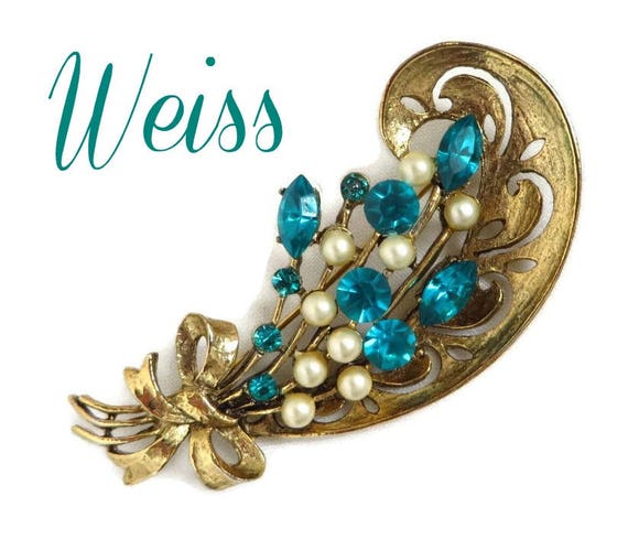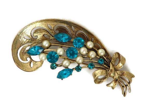 15% OFF coupon on Vintage Brooch, Rhinestone Pin, Blue Rhinestone Faux Pearl Brooch, Vintage Weiss Gold Tone Flower Pin, Gift for Her by LeesVintageJewels