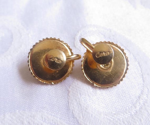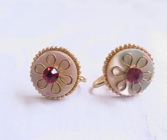 20% OFF coupon on Vintage Coro Earrings, Mother of Pearl with Gold Wire Overlay, Rhinestone Center, Screw back Earrings, Designer Signed by VintageVogueTreasure