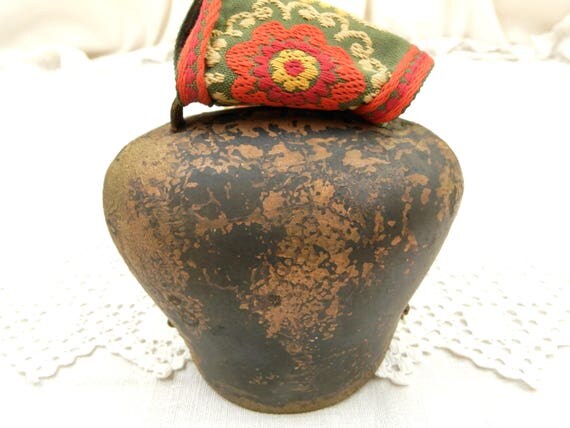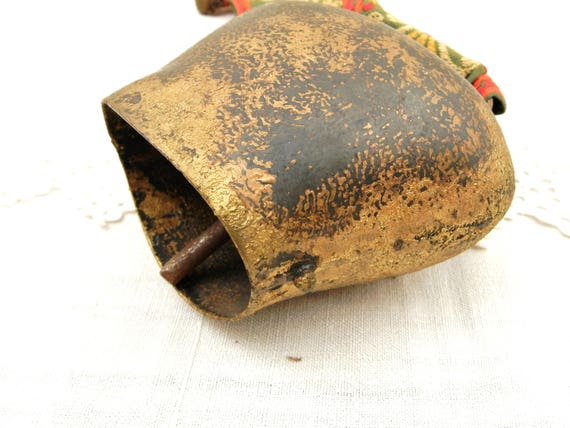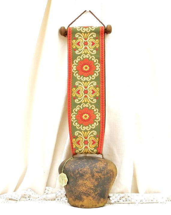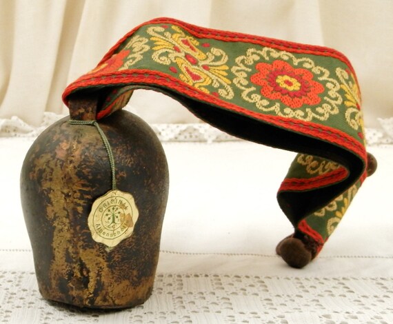 20% OFF coupon on Vintage Decorative Metal Cow Bell From the Alps with Woven Folk Pattern Fabric Braid, Original Alpenshelle Swiss Mountain Cowbell by VintageDecorFrancais