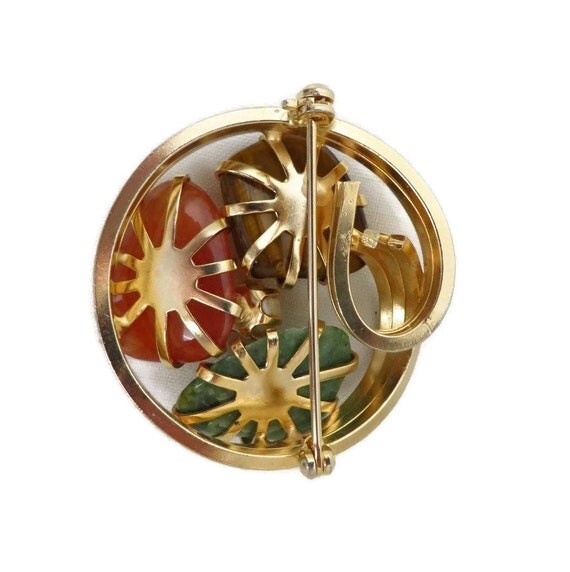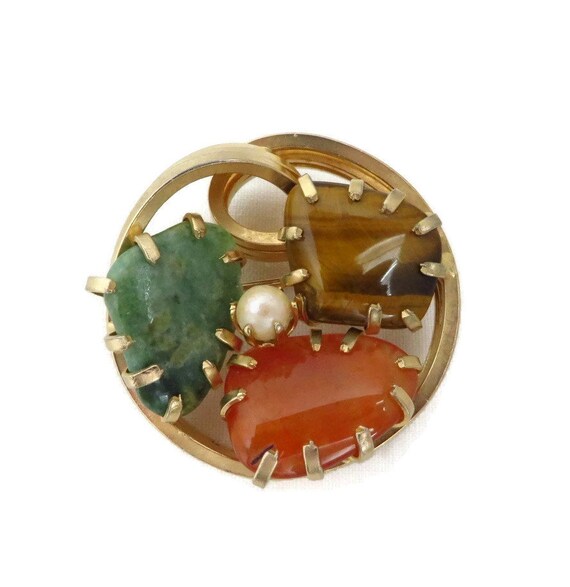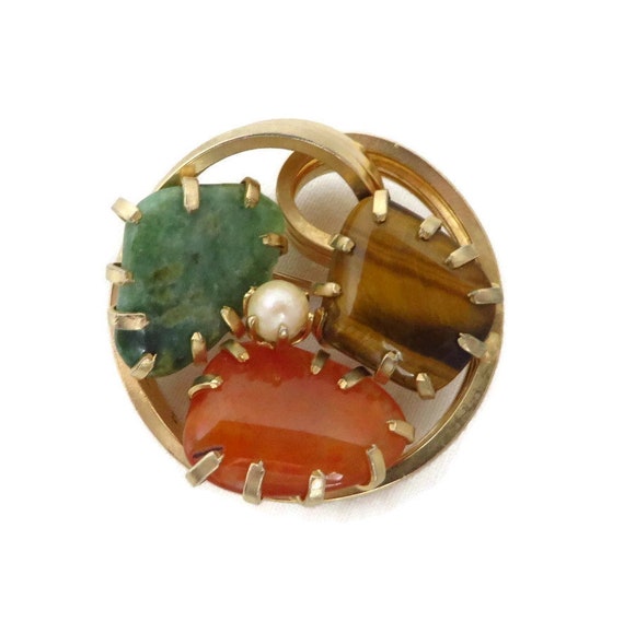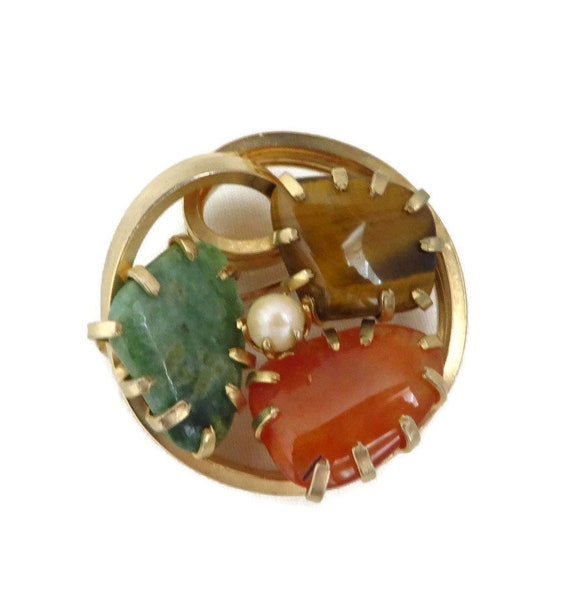 15% OFF coupon on Vintage Faux Jade Brooch, Tiger Eye, Carnelian, Pearl Gold Tone Circle Pin, Estate Jewelry by LeesVintageJewels