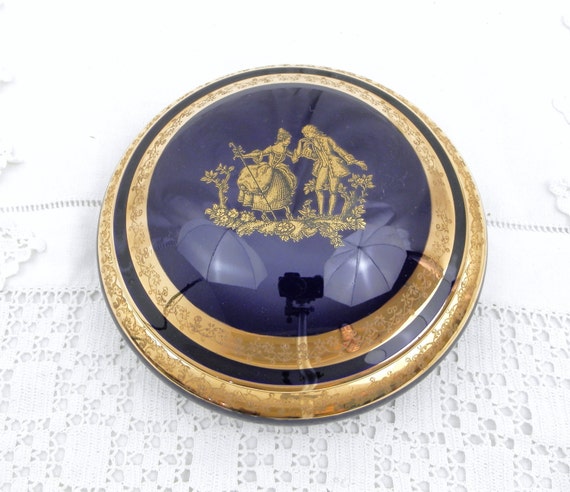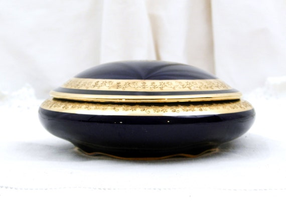 20% OFF coupon on Vintage French Bone China from Limoges Blue and Gold Glaze Powder Pot / French Decor / Chateau Chic / Dressing Table Make Up / Retro Home by VintageDecorFrancais