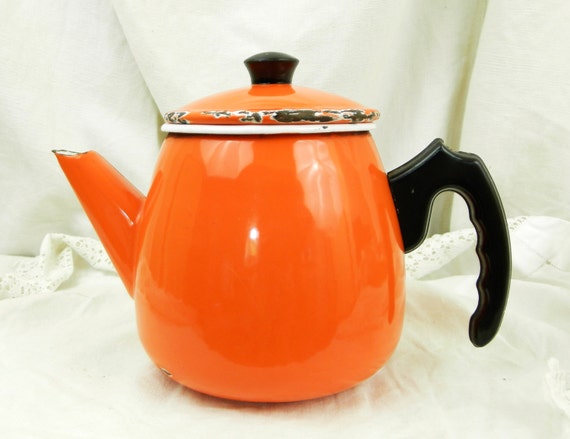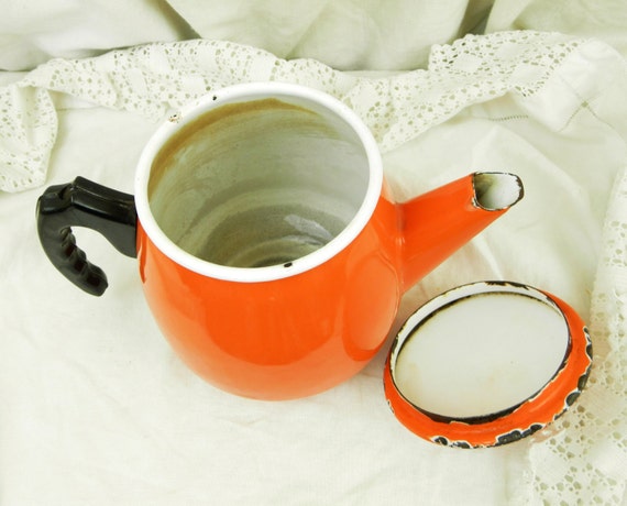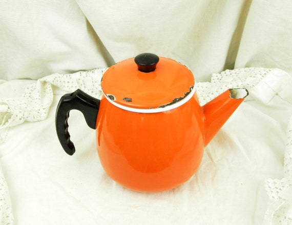 20% OFF coupon on Vintage French Mid Century Orange Enamelware Coffee Pot / Mid Century Modern Kitchenware / Kitchenalia /Chippy / Retro Vintage Home Interior by VintageDecorFrancais