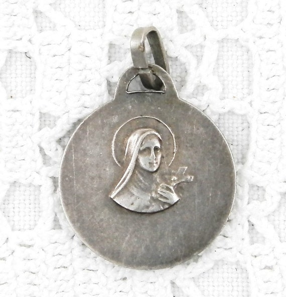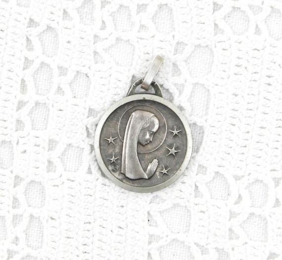 20% OFF coupon on Vintage French Mid Century Tarnished Silver Religious Medal of the Virgin Mary and Saint Theresa / St Therese, Christian Our Lady Charm by VintageDecorFrancais