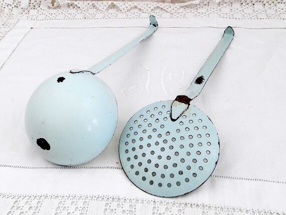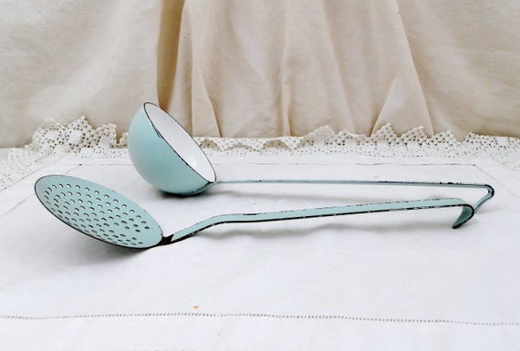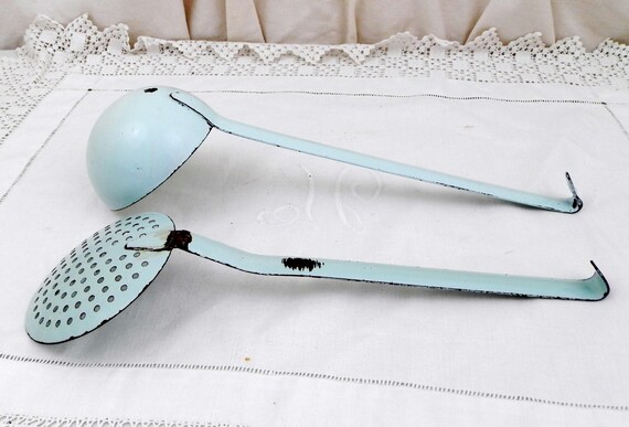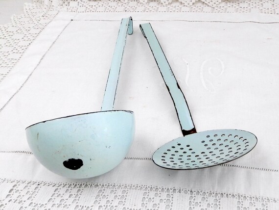 20% OFF coupon on Vintage French Mint Green White Chippy Enamelware Matching Ladle and Strainer, French Country Decor, Kitchen, Cooking Utensil, Retro Home by VintageDecorFrancais