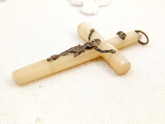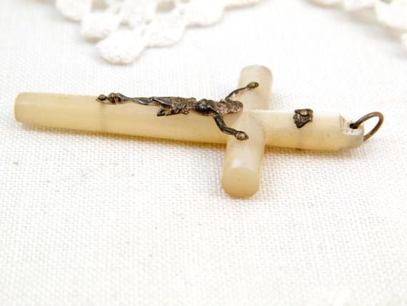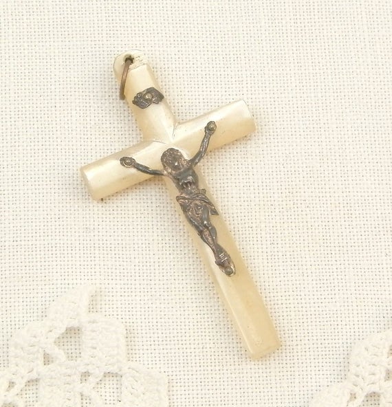 20% OFF coupon on Vintage French Mother of Pearl and Silver Plated Crucifix, French Catholic Cross Made of Nacre with Metal Jesus, Religious Jewelry by VintageDecorFrancais