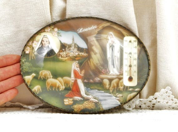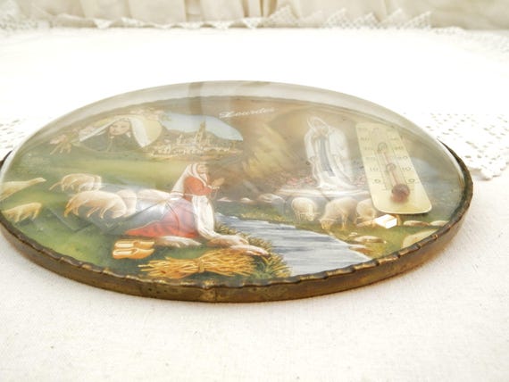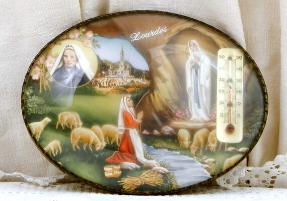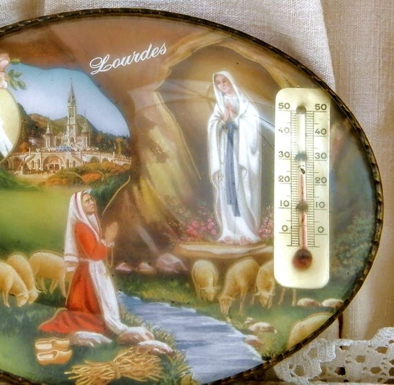 20% OFF coupon on Vintage French Novelty Religious Thermometer with Picture of Bernadette Soubirous of Lourdes with Virgin Mary Apparition inside Domed Glass by VintageDecorFrancais
