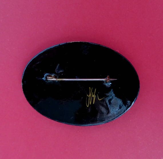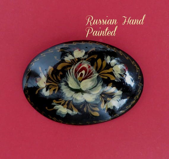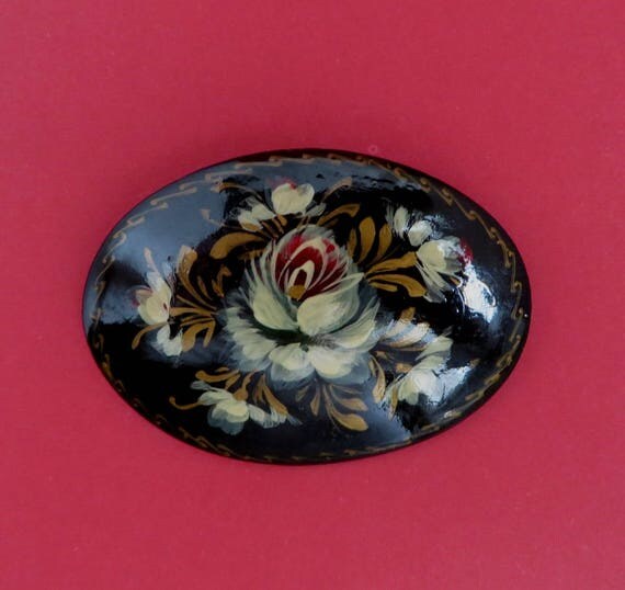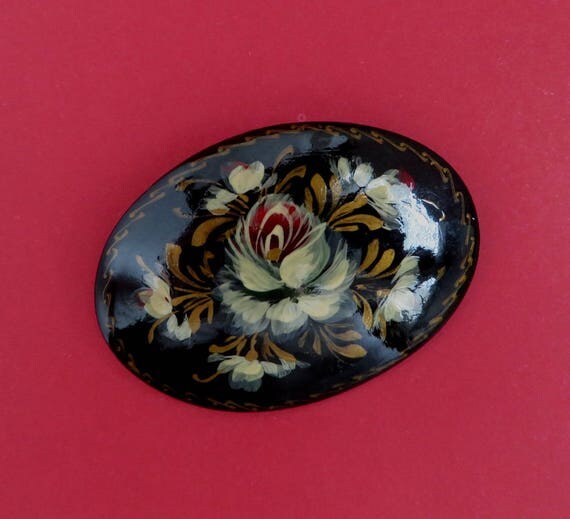 15% OFF coupon on Vintage Hand Painted Russian Brooch, Oval Black Lacquered Pin