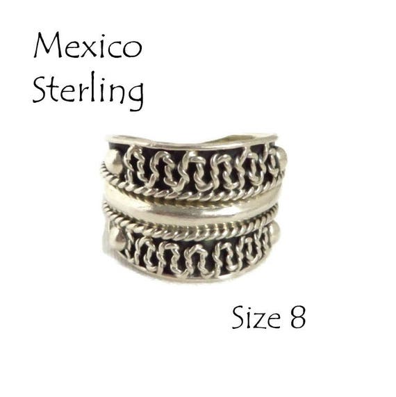 15% OFF coupon on Vintage Mexico Cigar Band Ring, Sterling Silver Scrolled, Braided Wide Band Ring, Size 8 by LeesVintageJewels