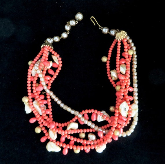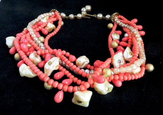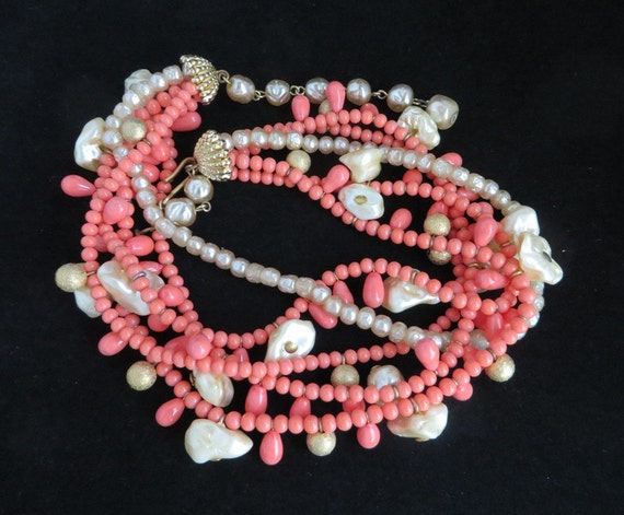 15% OFF coupon on Vintage Multistrand Necklace - Faux Coral & Pearl Beaded Choker, Gift Idea, Gift Boxed by LeesVintageJewels