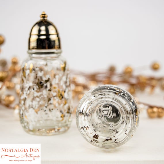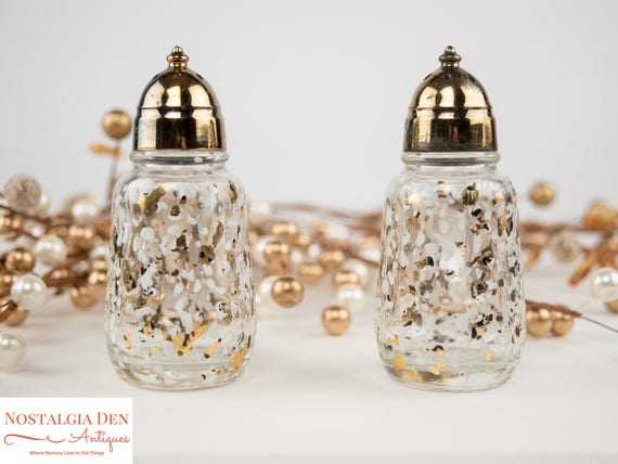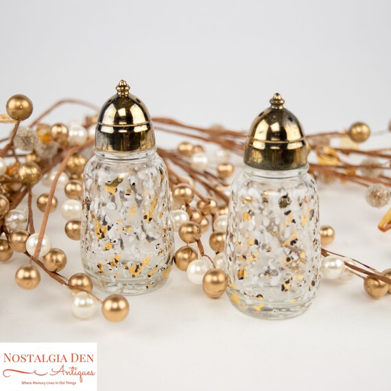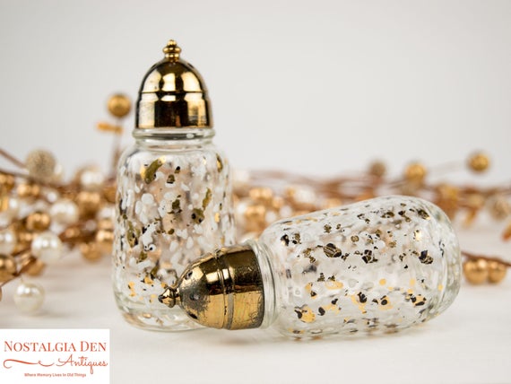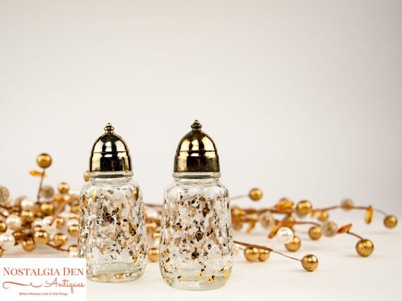 15% OFF coupon on Vintage Salt & Pepper Shakers | MCM Hazel Atlas Glass Gold / White Splatter Print by NostalgiaDenClassics