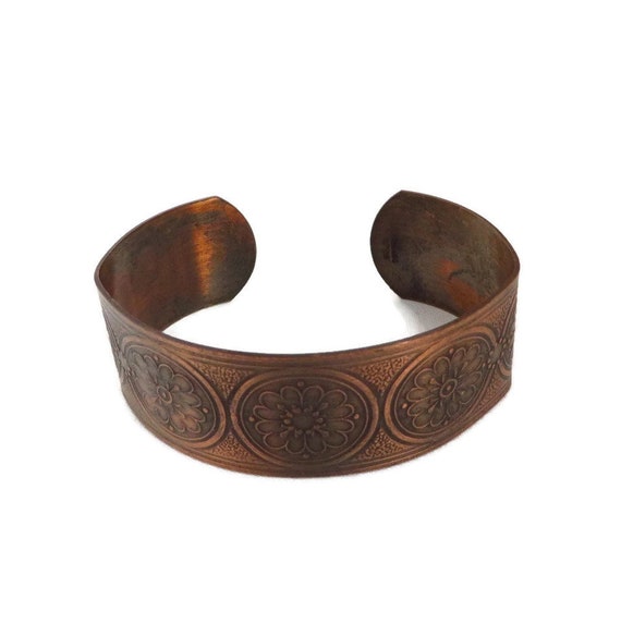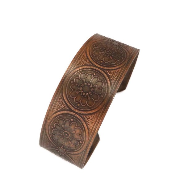 15% OFF coupon on Vintage Solid Copper Cuff, 1970s Flower Design Bracelet