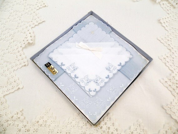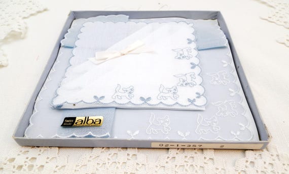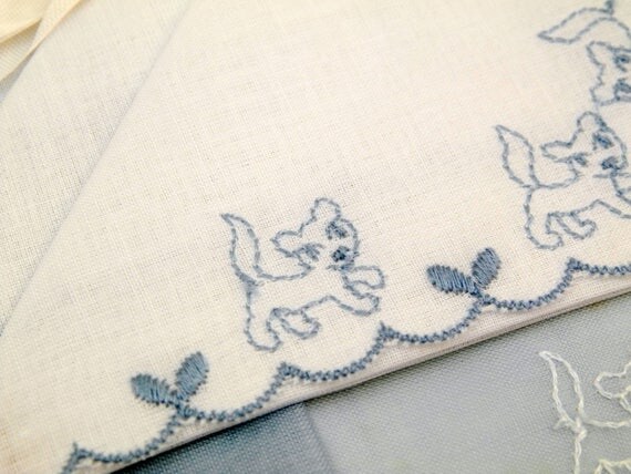 20% OFF coupon on Vintage Unused Boxed of 2 Blue and White Handkerchiefs Embroidered with Puppy Dogs Made in Switzerland by Alba, Swiss Hankies by VintageDecorFrancais