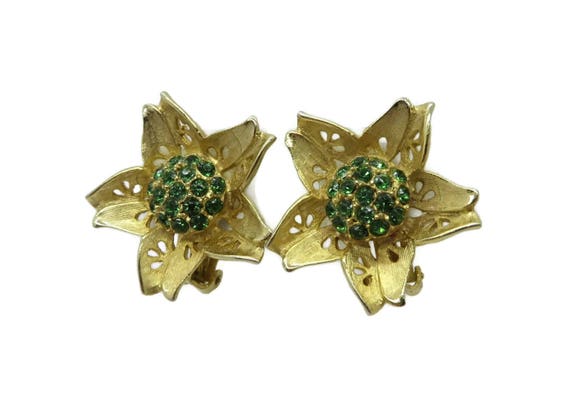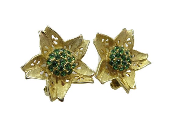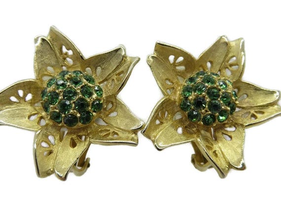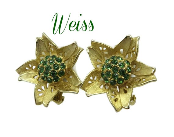 15% OFF coupon on Vintage Weiss Earrings - Green Rhinestone Gold Tone Flower Clip-on Earrings, Mid Century Designer Signed Jewelry, Gift idea, Gift Boxed by LeesVintageJewels