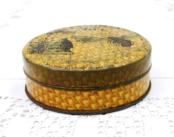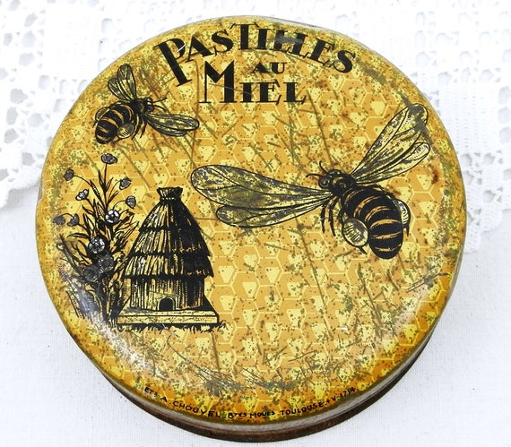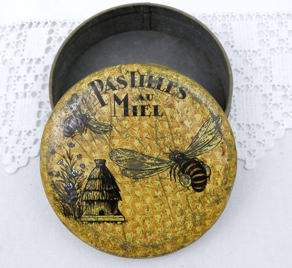 20% OFF coupon on Vintage Yellow Honey Candie Lozenges Metal Tin with Bees and Hive Pattern from France, French Medicinal Tablets, Pastilles de Miel by VintageDecorFrancais