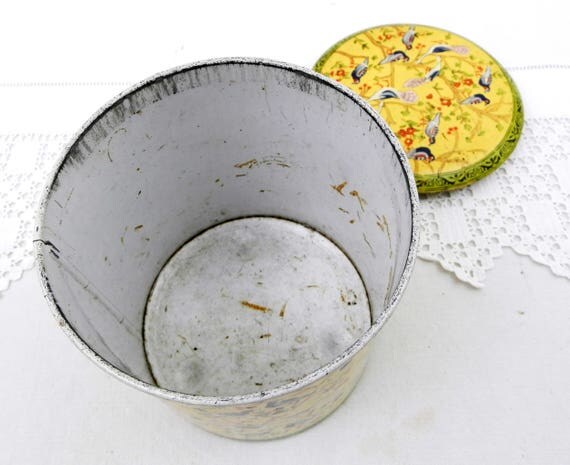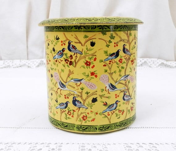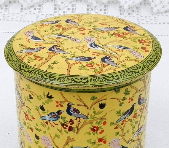 20% OFF coupon on Vintage Yellow Persian Bird and Foliage Style Pattern Round Metal Tin, Retro Cookie Tin with Parrots and Peacock Motif on Yellow with Green by VintageDecorFrancais