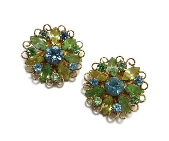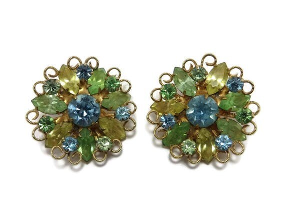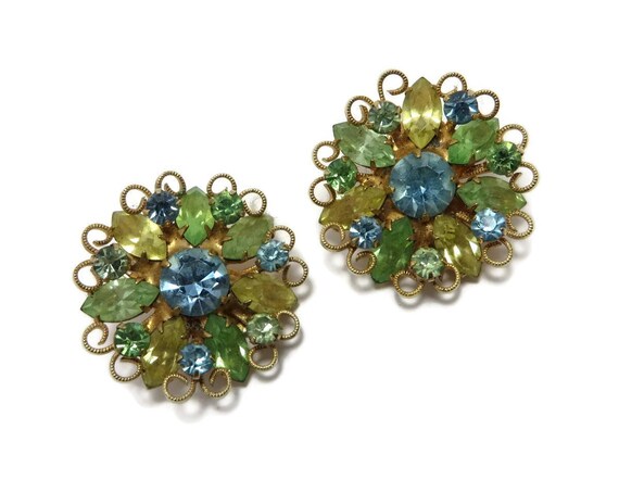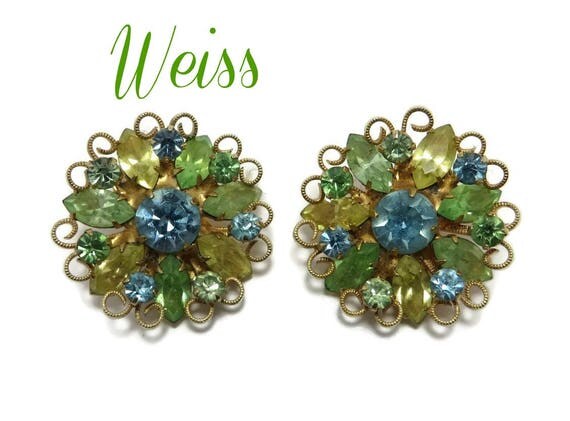 15% OFF coupon on Weiss Flower Rhinestone Earrings, Vintage Green Yellow Blue Earrings, Signed Weiss Jewelry by LeesVintageJewels