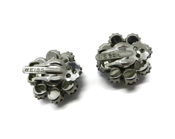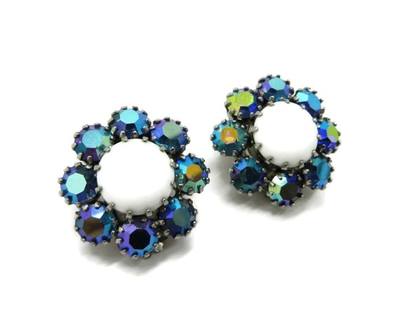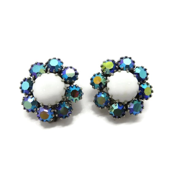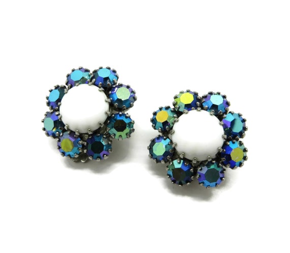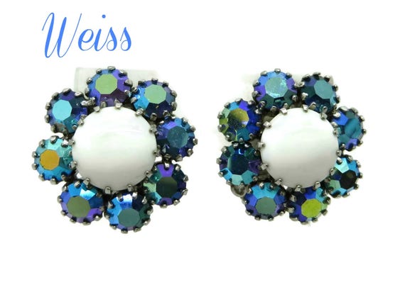 15% OFF coupon on Weiss Milk Glass Earrings, Vintage AB Rhinestone Flower Clip-on Earrings by LeesVintageJewels