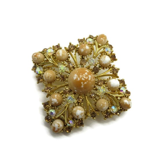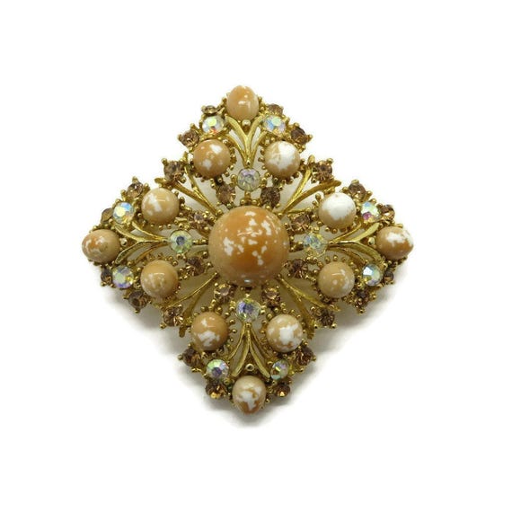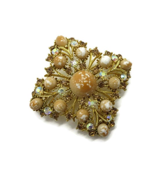 15% OFF coupon on Weiss Orange and White Bead Rhinestone Studded Gold Tone Vintage Brooch by LeesVintageJewels