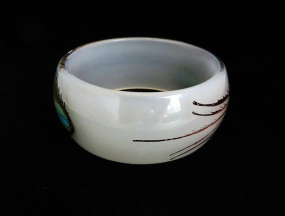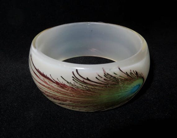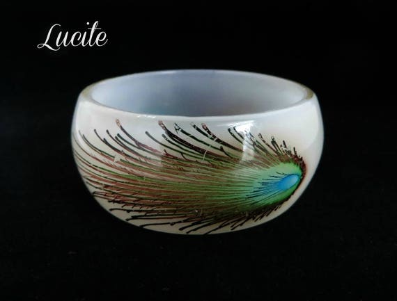 15% OFF coupon on White Lucite Bracelet - Vintage Lucite Bangle, Peacock Feather Bracelet, Chunky Bangle by LeesVintageJewels